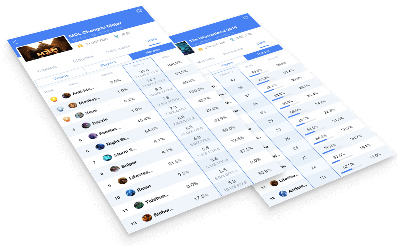 Provide statistical data such as Wins%, KDA, First Blood%; Ban%, Pick%, etc.,which will be used to analyze the hero's comprehensive ability