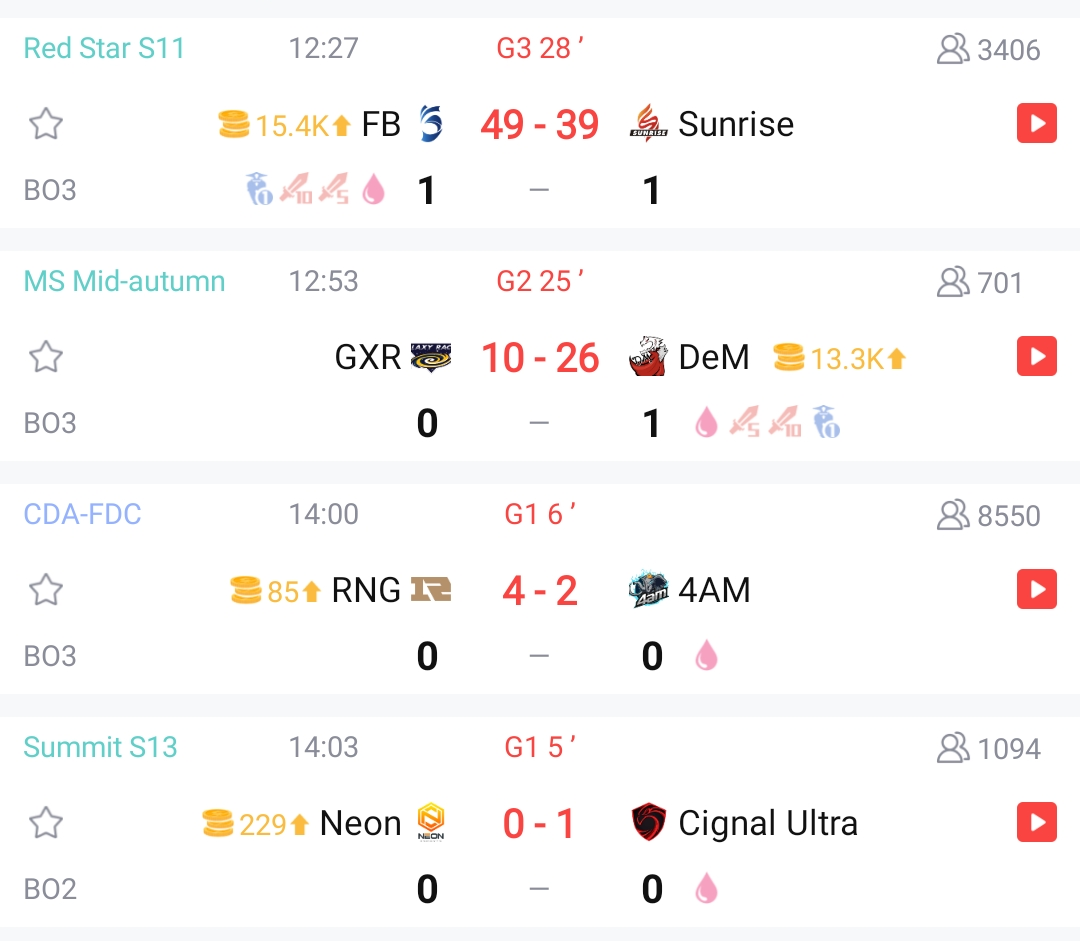 Show team and events names, abbreviations, logo, start time, Status, BO, total score, and supports the selection of the event schedule you follow according to the corresponding conditions.